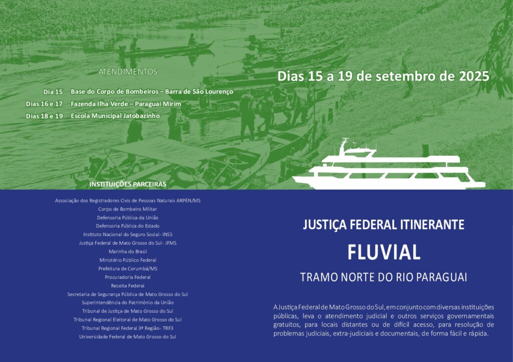 A Justiça Federal de Mato Grosso do Sul realizará, entre os dias 15 e 19 de setembro, uma nova etapa do programa Justiça Itinerante Fluvial no tramo norte do rio Paraguai. Com parceria da Prefeitura de Corumbá, a iniciativa vai oferecer atendimento judicial e emissão de documentos a moradores de regiões de difícil acesso no Pantanal.