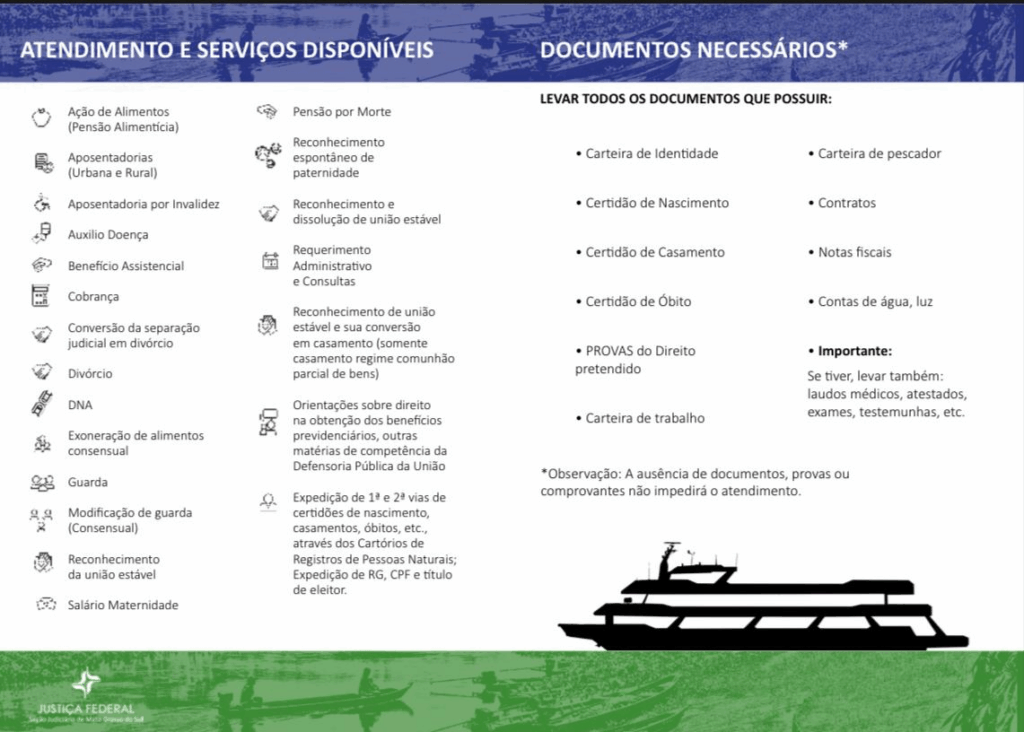 O barco fará paradas na base do Corpo de Bombeiros – Barra de São Lourenço, na Fazenda Ilha Verde – Paraguai Mirim, e na Escola Municipal Jatobazinho. Serão oferecidos serviços como ações de pensão alimentícia, divórcios, reconhecimento de união estável, aposentadorias, benefícios assistenciais e perícias médicas.