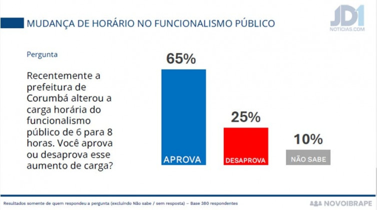 A pesquisa também avaliou a percepção da população sobre a recente alteração na carga horária dos servidores públicos municipais, que passou de seis para oito horas diárias. Segundo o levantamento, 65% dos entrevistados aprovam a mudança, 25% desaprovam e 10% não souberam responder.